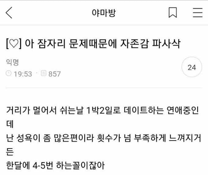 ์ฑ๊ด๊ณ ํ ์์กด๊ฐ์ด ๋จ์ด์ก๋ค๋ ์ฌ์ฑ์ ๊ณ ๋ฏผ๊ธ๋ก, ๋๊ธ์์ ๋ค์ํ ์กฐ์ธ์ด ์ด์ด์ง ๊ธ์